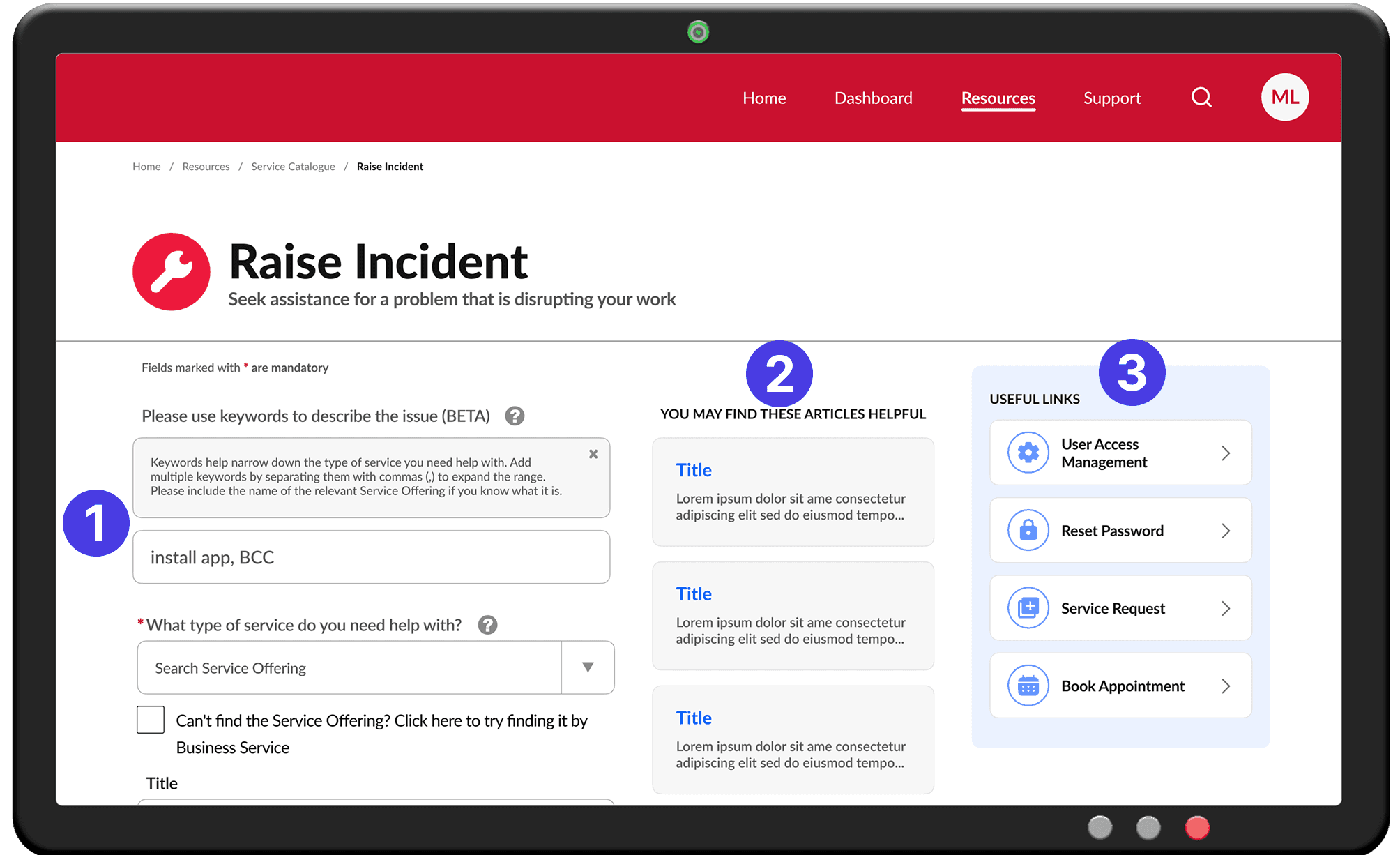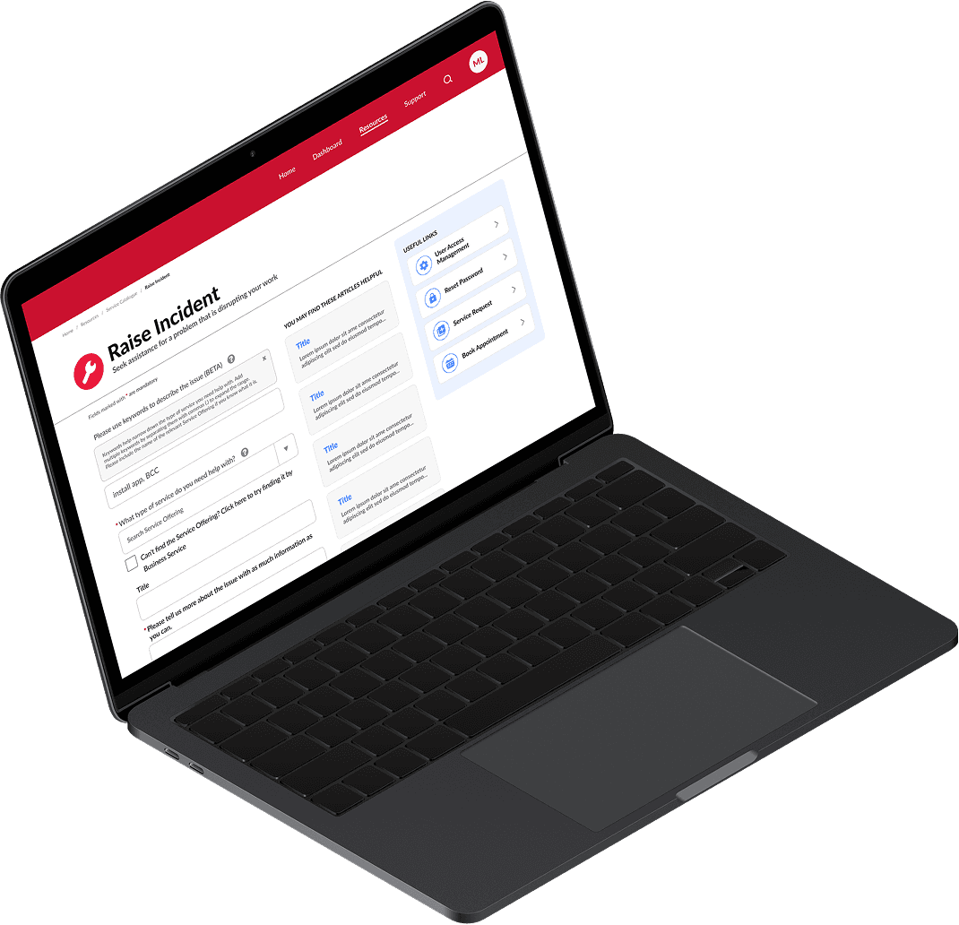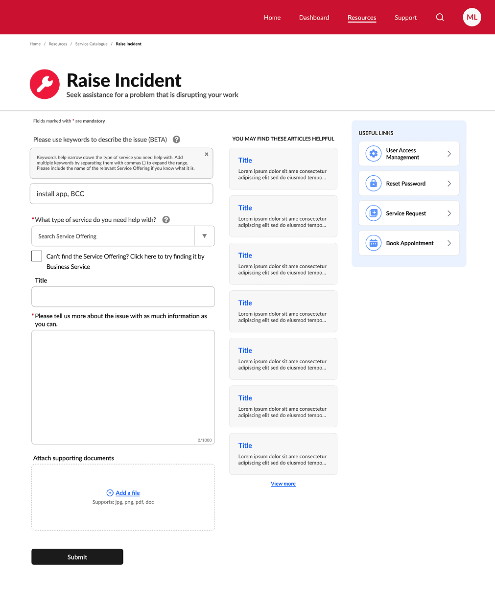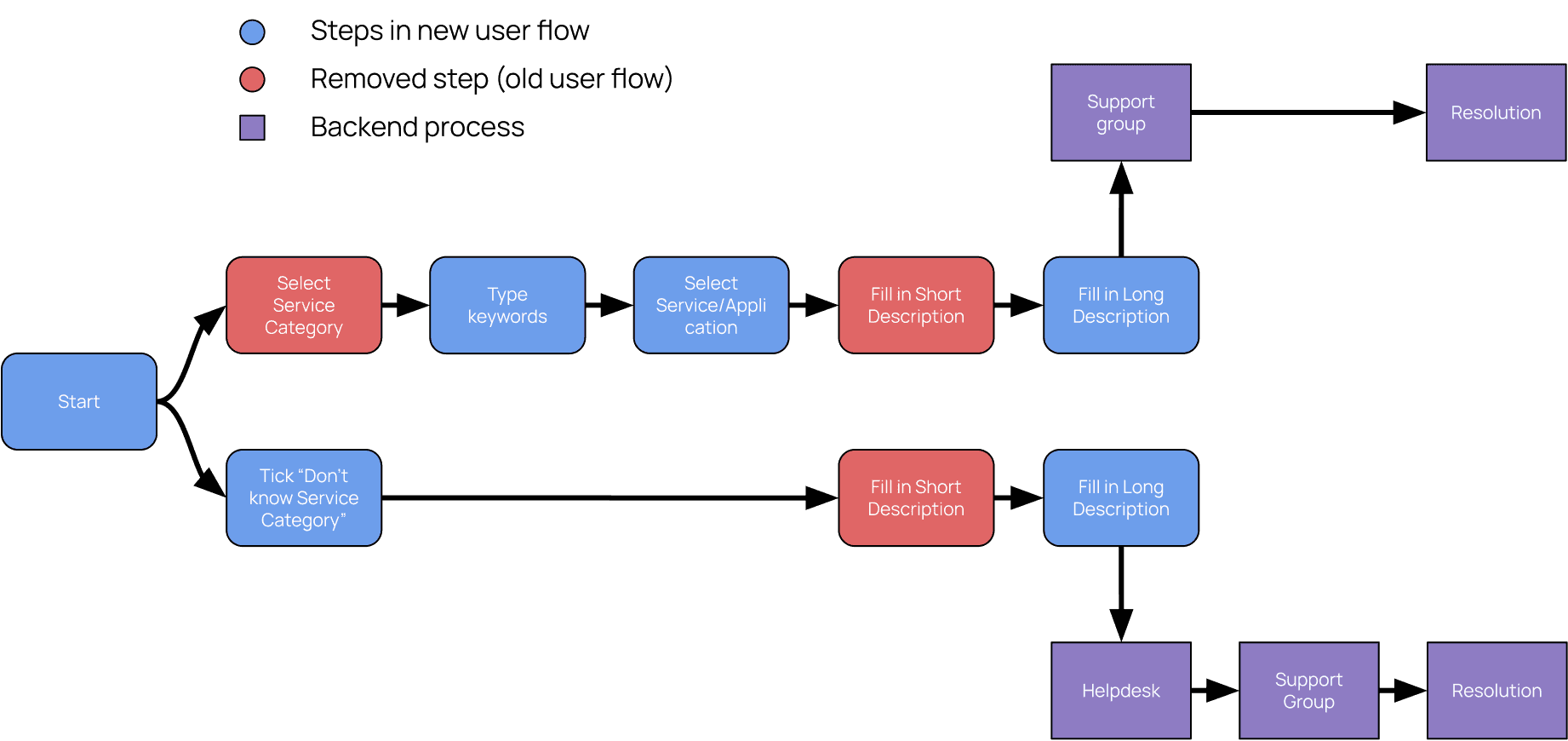 Based on the prioritisation exercise, I decided to start with the redesign of the IT issue reporting form. It had emerged as a major pain point during the user interviews, especially when it came to picking the right category for the user's issue to ensure their ticket would go to the right person. The team had determined that improving this workflow would have a large and immediate impact on the portal's UX.