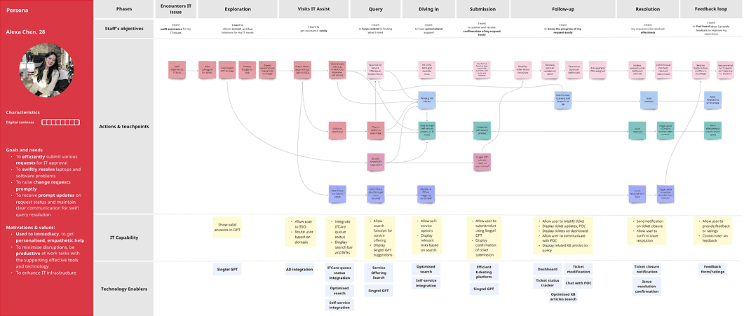 Next, to envision what the final user experience would look like, we assembled the solutions we had decided to work on into an ideal user journey for the IT support process.