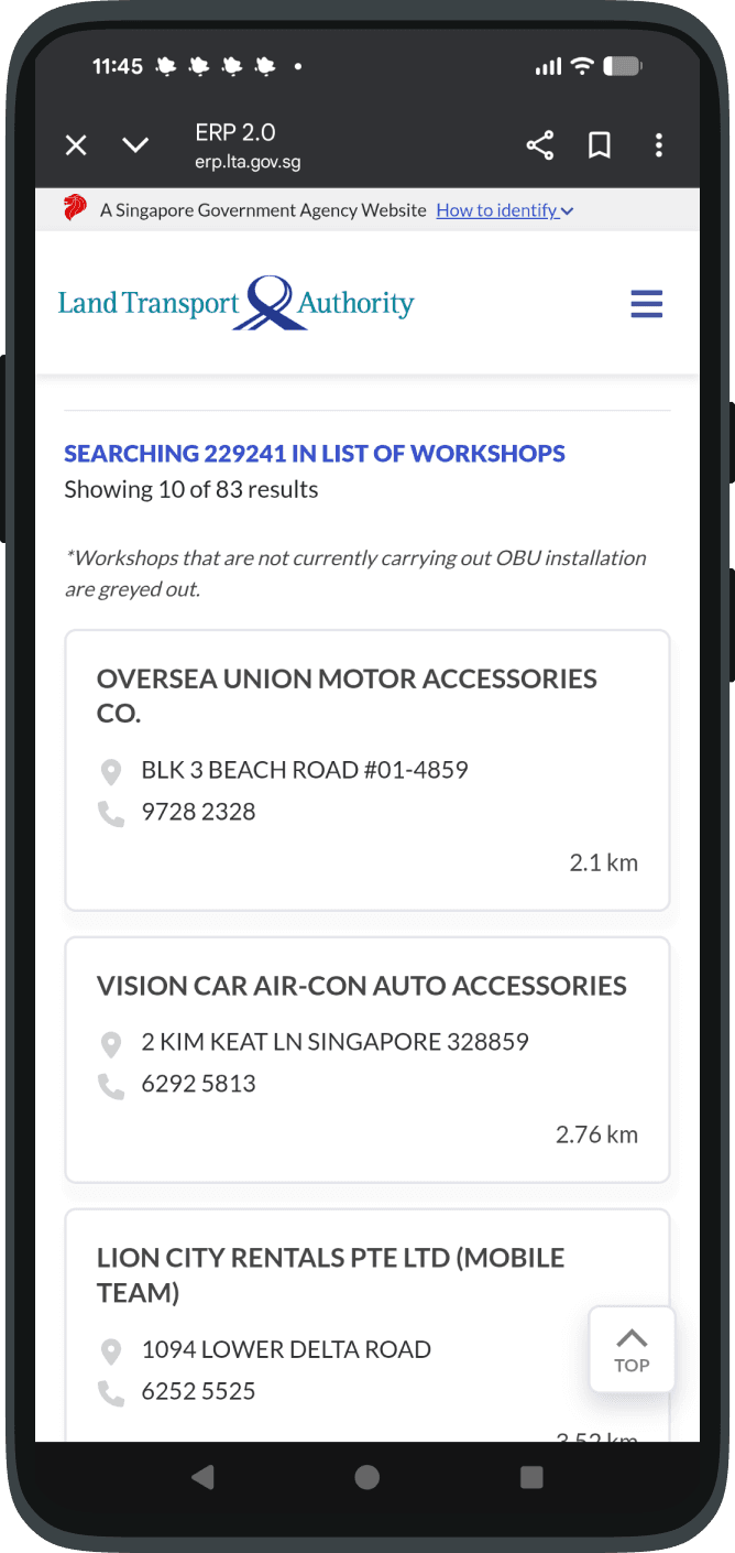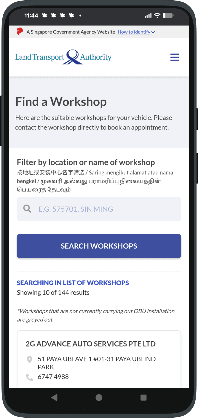 The live version features a much simpler workshop finder, which provides users with workshops' contact details. Users would then have to get in touch with the workshops to arrange their appointments themselves.